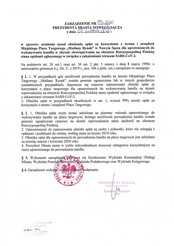 Prezydent Ludomir Handzel podpisał zarządzenie na mocy którego zostanie udzielona obniżka opłat o 99 % za korzystanie z terenu i urządzeń Placu Targowego. Obniżka jest udzielana za miesiąc marzec i kwiecień 2020 r.