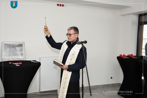 Po przecięciu wstęgi, ksiądz prałat dr Jerzy Jurkiewicz poświęcił budynek.