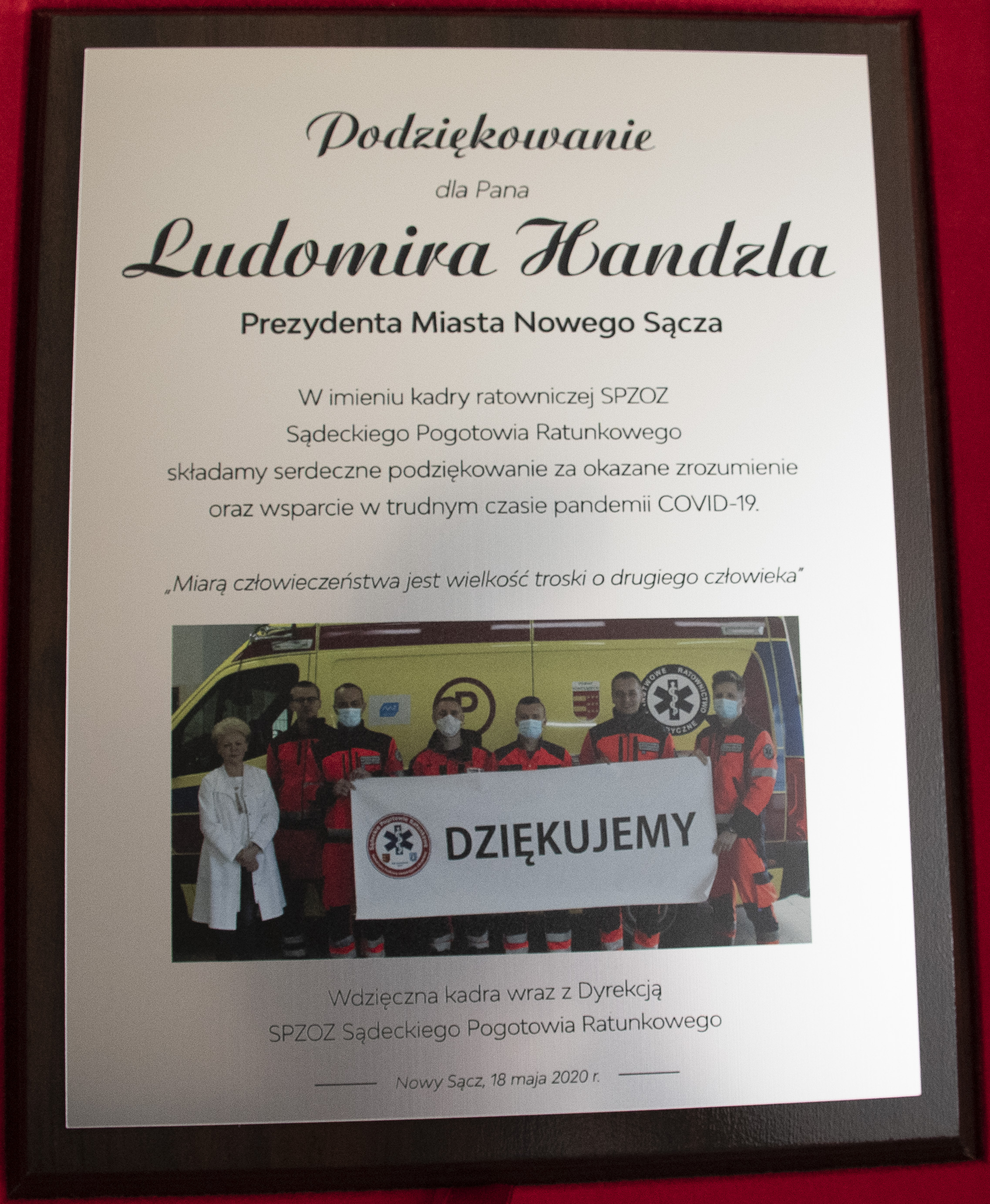 - Panie Prezydencie dziękujemy, że wyciągnął Pan do nas rękę gdy staliśmy na czele walki z koronawirusem – powiedziała dyrektor Sądeckiego Pogotowia Ratunkowego Bożena Hudzik. – Zrozumiał Pan, że dla ratowników medycznych nie ma nic ważniejszego od spokoju i poczucia bezpieczeństwa dla swoich rodzin. Niech ten drobny grawerton będzie dowodem naszej dozgonnej wdzięczności.