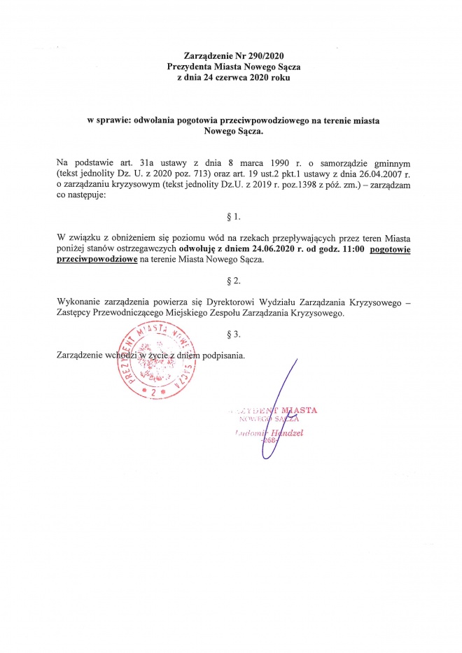 W związku z obniżeniem poziomu wód poniżej stanów ostrzegawczych na rzekach przepływających przez teren Miasta Nowego Sącza, Prezydent Miasta Ludomir Handzel odwołuje w dniu 24 czerwca na terenie Nowego Sącza Pogotowie przeciwpowodziowe.