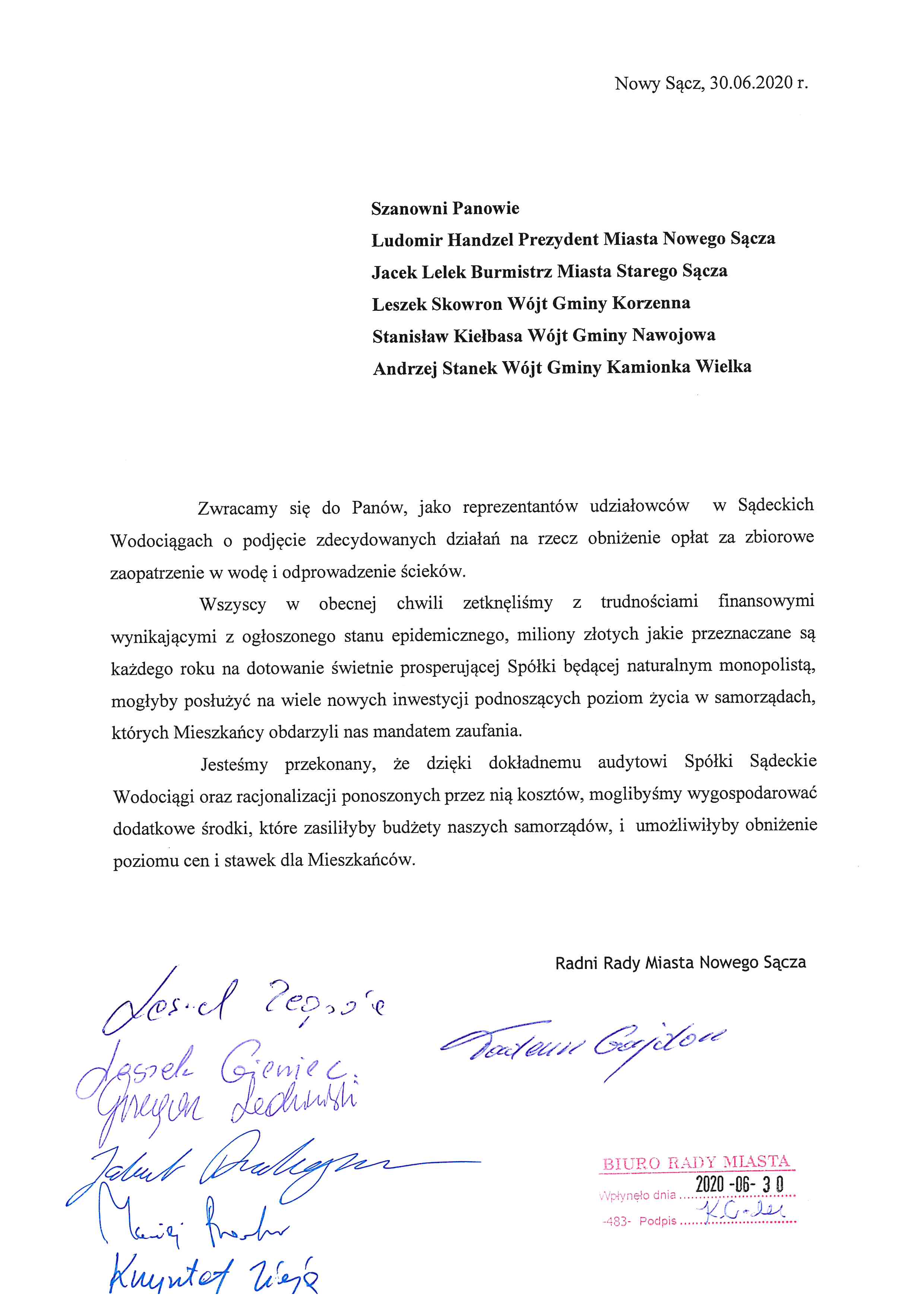 Grupa Radnych Miasta Nowego Sącza zwróciła się do udziałowców Spółki Sądeckie Wodociągi w sprawie podjęcia zdecydowanych działań na rzecz obniżenia opłat za zbiorowe zaopatrzenie w wodę i odprowadzanie ścieków.