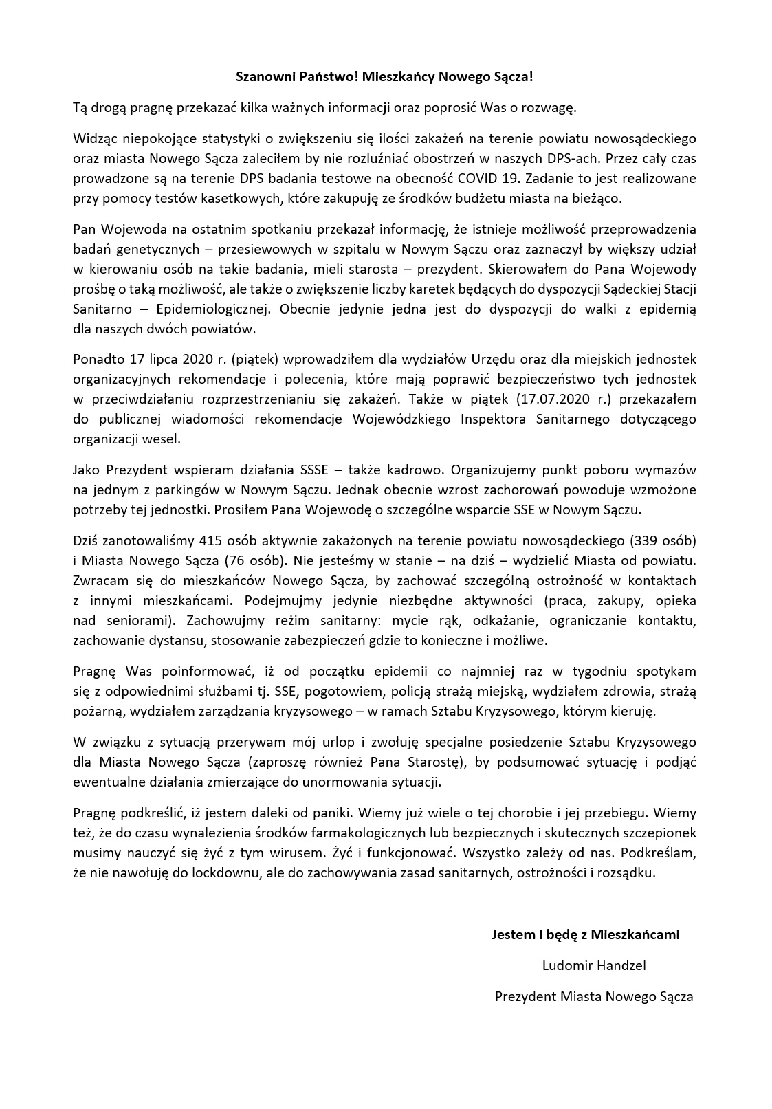 Szanowni Państwo! Mieszkańcy Nowego Sącza!
