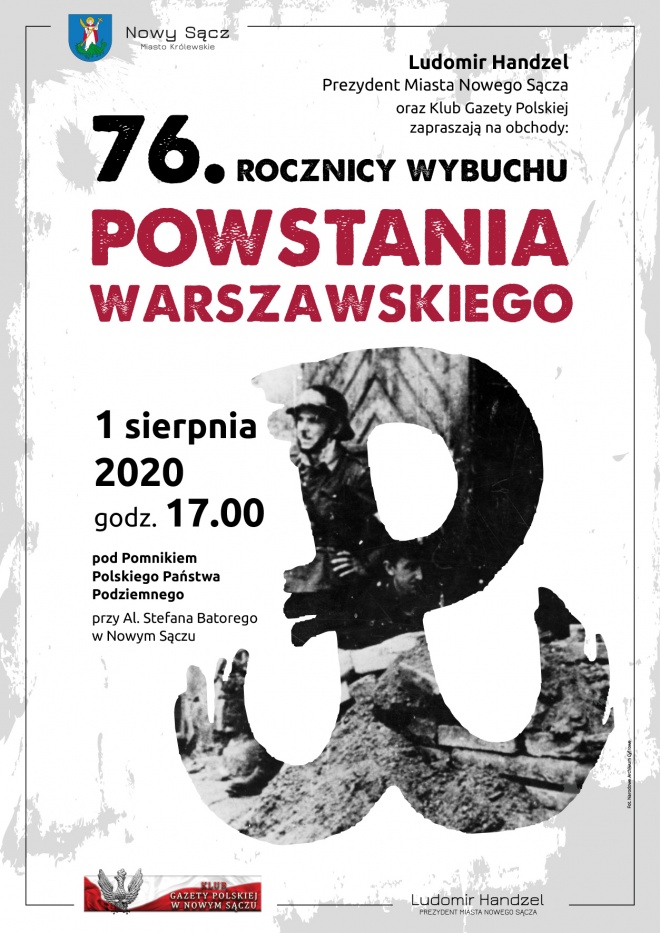 Ludomir Handzel, prezydent Miasta Nowego Sącza oraz Klub Gazety Polskiej zapraszają na obchody 76. rocznicy Wybuchu Powstania Warszawskiego.