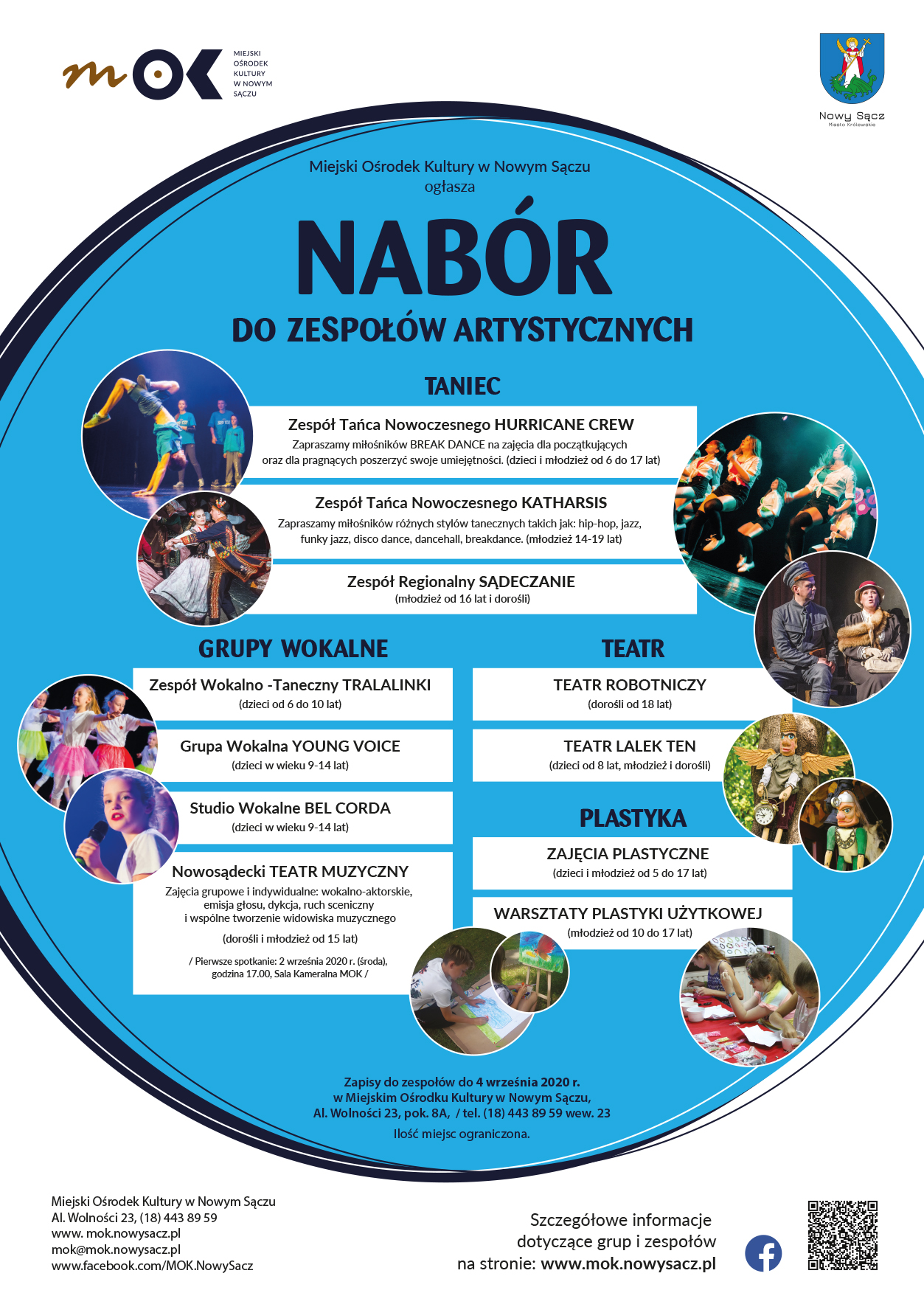 NABÓR DO ZESPOŁÓW ARTYSTYCZNYCH - Zespoły Tańca Nowoczesnego HURRICANE CREW i KATHARSIS / Zespół Wokalno - Taneczny TRALALINKI / Zespół Regionalny SĄDECZANIE / Grupa Wokalna YOUNG VOICE / Studio Wokalne BEL CORDA Nowosądecki TEATR MUZYCZNY / TEATR ROBOTNICZY / TEATR LALEK TEN / ZAJĘCIA PLASTYCZNE / WARSZTATY PLASTYKI UŻYTKOWEJ. Więcej informacji na plakacie.