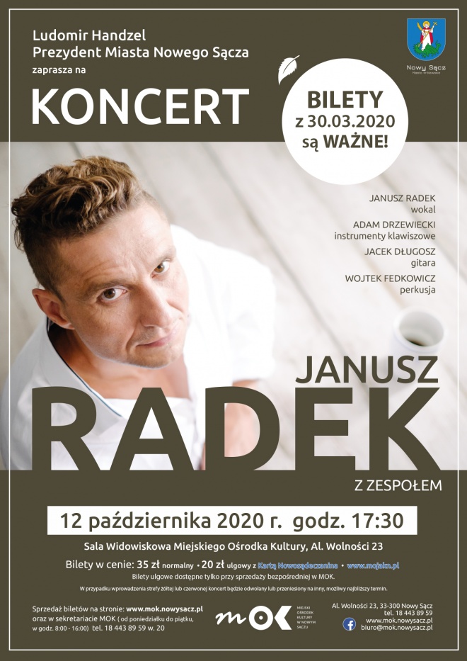 Prezydent Miasta Nowego Sącza Ludomir Handzel zaprasza na koncert, który odbędzie się 12 października 2020 r. o godzinie 17.30 w Sali Widowiskowej Miejskiego Ośrodka Kultury, al. Wolności 23. Więcej informacji na plakacie.