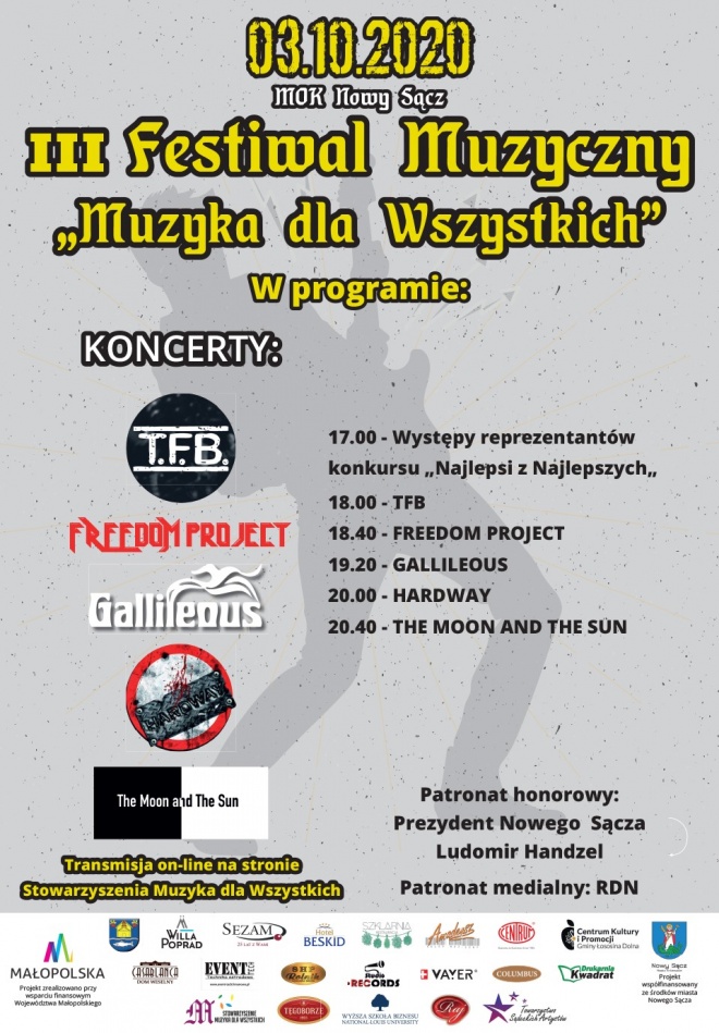 Zapraszamy na koncert finałowy Festiwalu Rockowego "Muzyka dla Wszystkich 2020", który odbędzie się 3 października 2020r. w sali koncertowej nowosądeckiego MOK-u. Koncert patronatem honorowym objął Prezydent Miasta Nowego Sącza Ludomir Handzel.