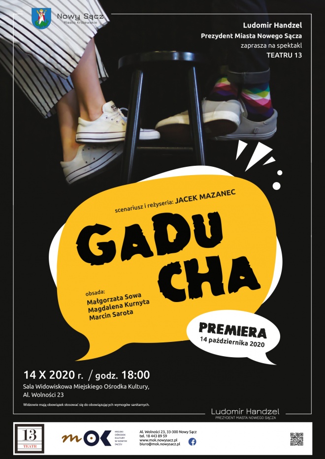 Prezydent Miasta Nowego Sącza Ludomir Handzel zaprasza na spektakl TEATRU 13. Spektakl odbędzie się 14 października na Sali Widowiskowej Miejskiego Ośrodka Kultury w Nowym Sączu. Więcej Informacji na plakacie.