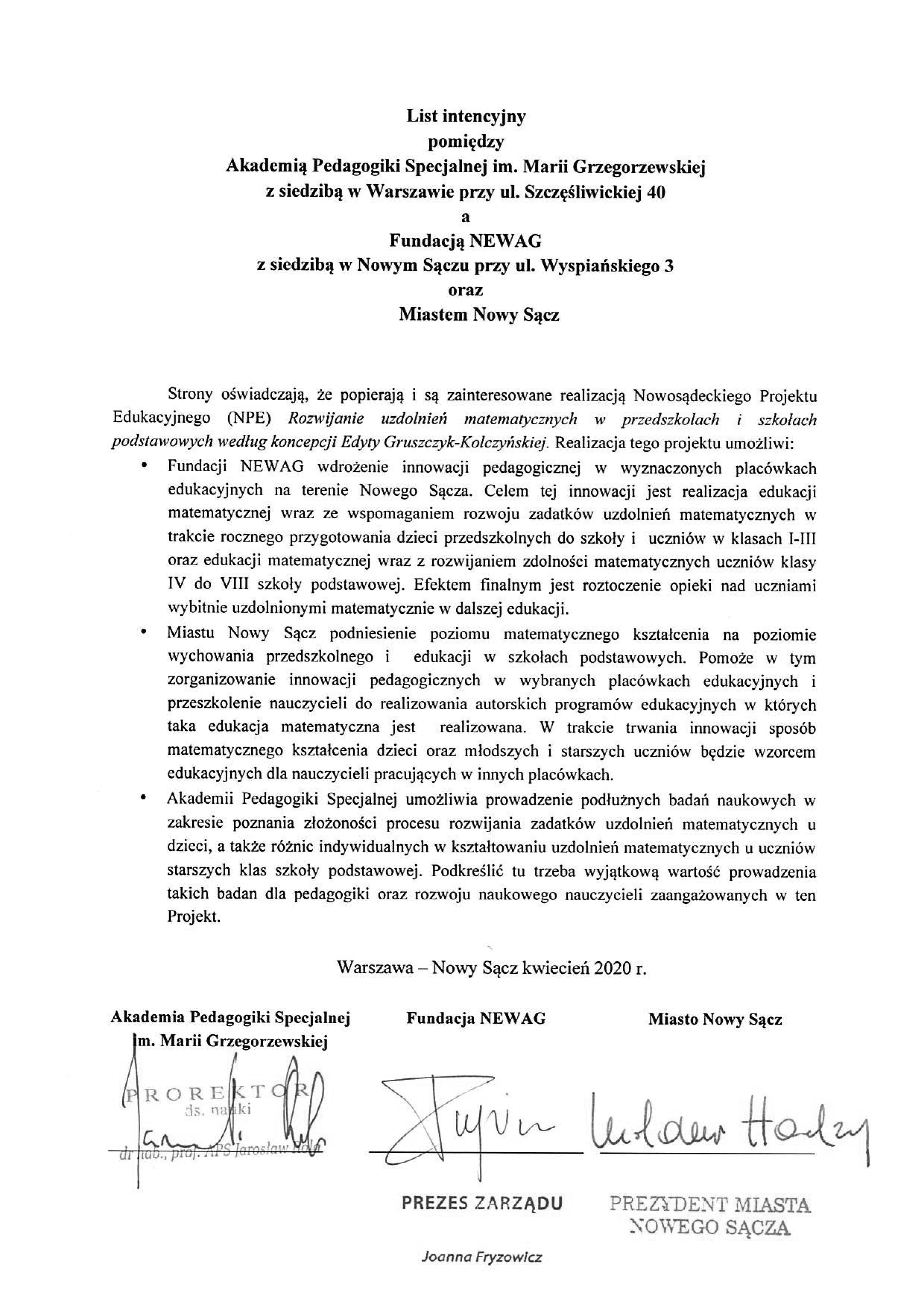 Miasto Nowy Sącz przystąpiło do realizacji tego zadania i w ramach przygotowań nawiązało współpracę z Panią Profesor Edytą Gruszczyk- Kolczyńską z Warszawskiej Akademii Pedagogiki Specjalnej.