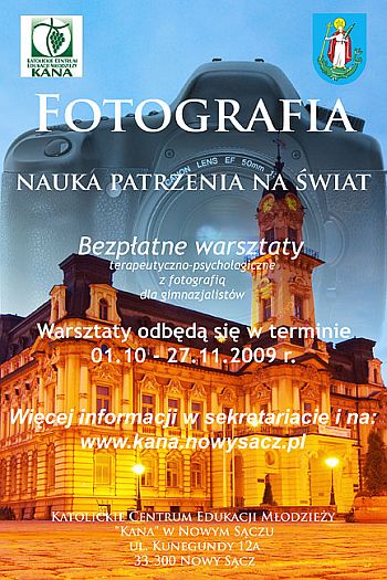 Katolickie Centrum Edukacji Młodzieży "Kana" w Nowym Sączu rozpoczęło przygotowania do organizacji warsztatów terapeutyczno - psychologicznych z fotografią dla gimnazjalistów pn. "Fotografia - nauka patrzenia na świat” - edycja jesienna.