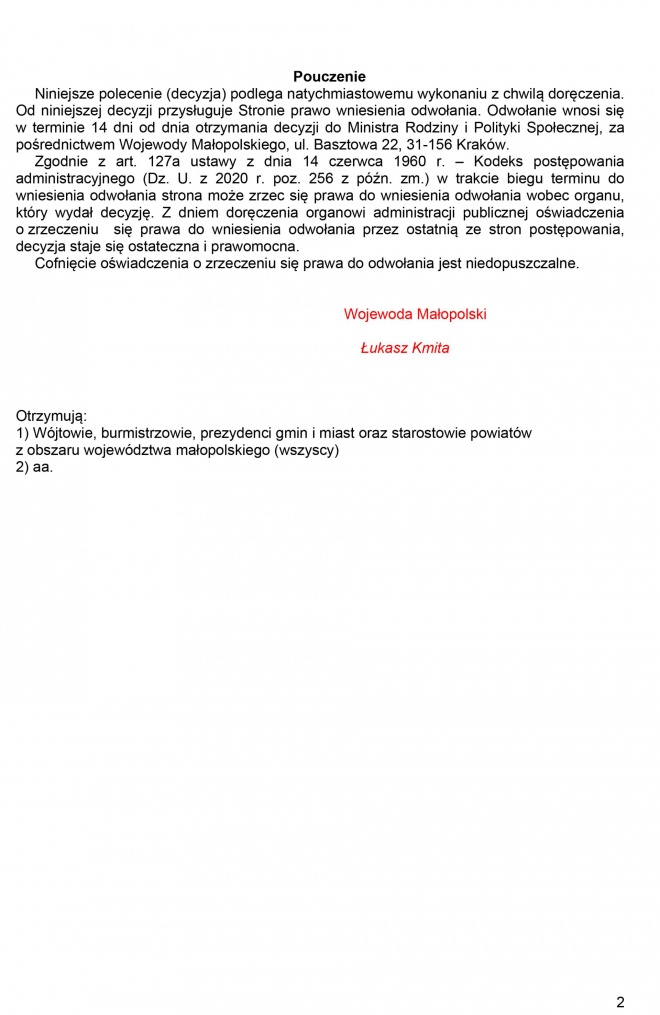 Wojewoda Małopolski wydał Decyzję nr 272/2020 (Polecenie nr 348/2020) w sprawie uchylenia decyzji nr 138/2020 (Polecenie nr 214/2020) Wojewody Małopolskiego z dnia 14 października 2020 roku, znak: WP-III.9421.16.283.2020 skierowaną do wszystkich wójtów, burmistrzów, prezydentów gmin i miast oraz starostów powiatów z obszaru województwa małopolskiego, w sprawie zawieszenia działalności w placówkach dla osób starszych, środowiskowych domach samopomocy oraz warsztatach terapii zajęciowej na terenie całego województwa małopolskiego.