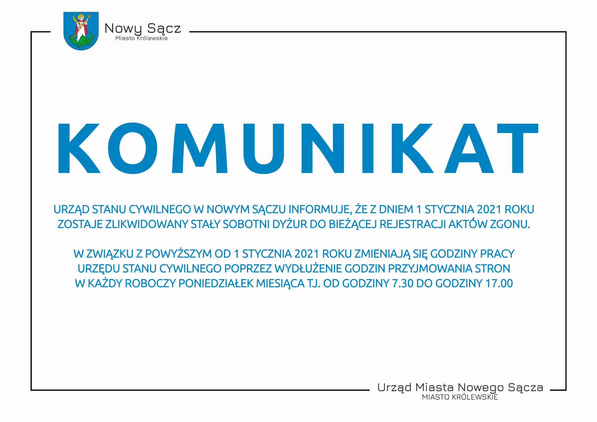 Urząd Stanu Cywilnego w Nowym Sączu informuje, że z dniem 1 stycznia 2021 roku zostaje zlikwidowany stały sobotni dyżur do bieżącej rejestracji aktów zgonu.