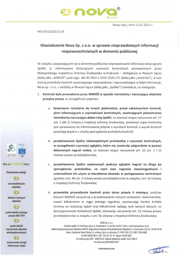 Oświadczenie Spółki Nova w sprawie nieprawdziwych informacji rozpowszechnianych w domenie publicznej.
