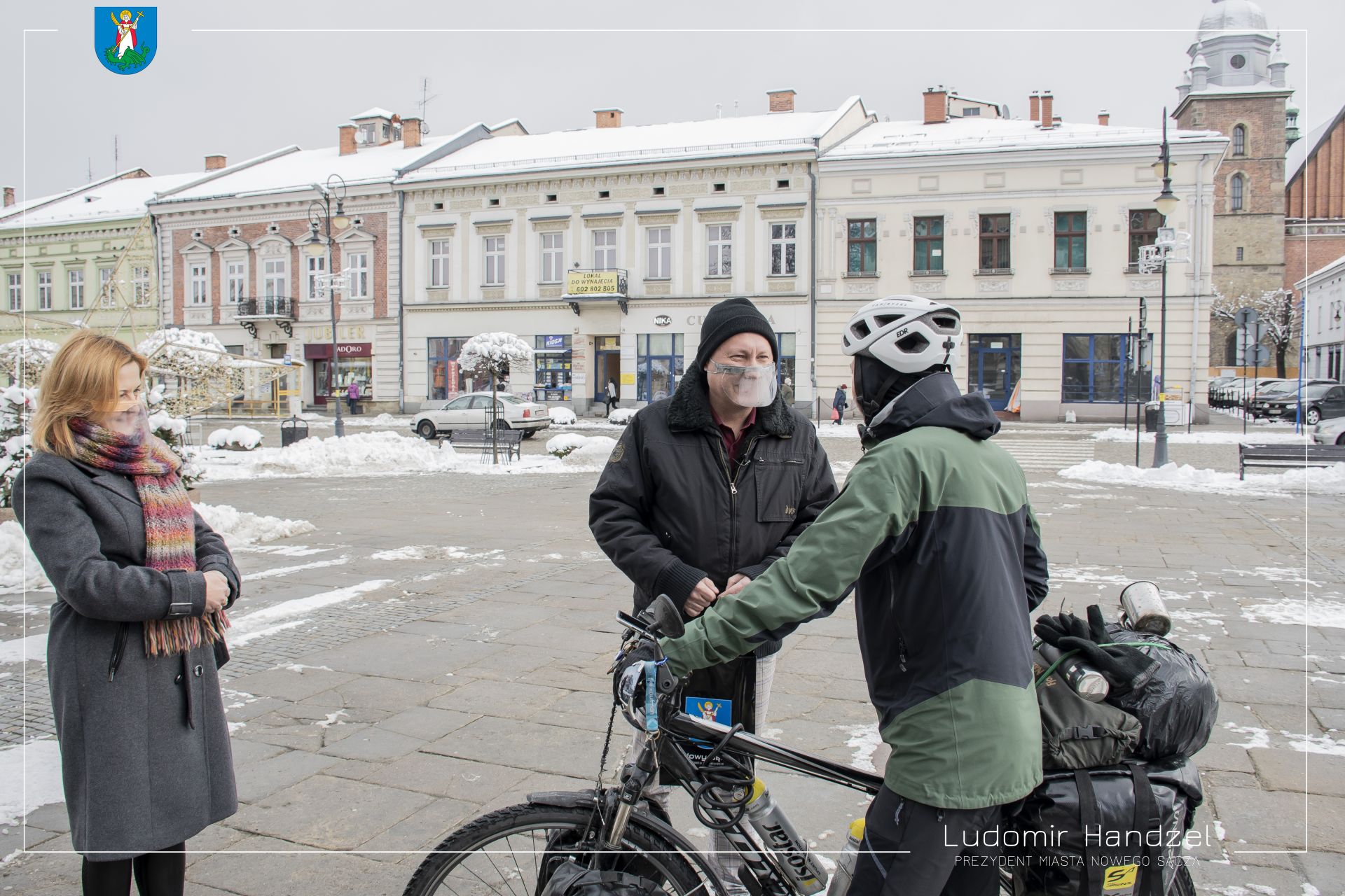 Paweł Małaszko przejedzie ponad 3500 kilometrów wzdłuż granicy naszego kraju. Przy okazji wspiera Wielką Orkiestrę Świątecznej Pomocy i zbiera fundusze za pośrednictwem internetowej skarbonki. Wczoraj zawitał do Nowego Sącza i został przywitany przez WOŚP Nowy Sącz. Dziś prezydent Ludomir Handzel wraz ze swoim zastępcą Magdaleną Majką pożegnali rowerzystę i życzyli udanej wyprawy.