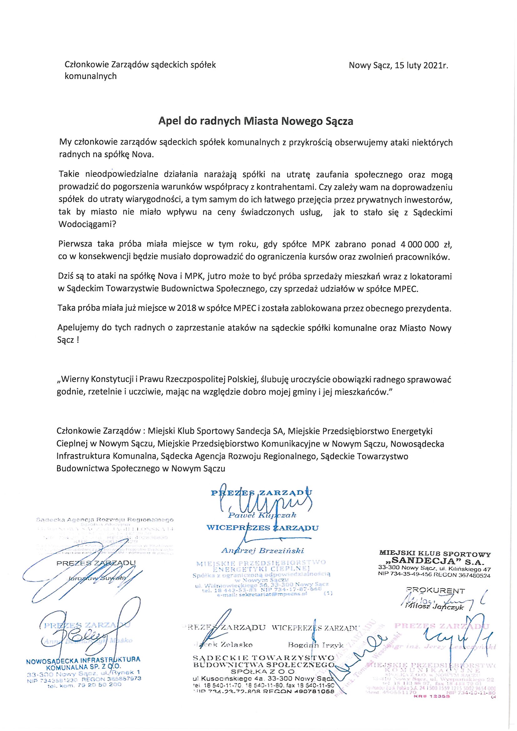 Zastępca prezydenta Artur Bochenek zaprezentował apel zarządów spółek komunalnych o zaprzestanie ataków niektórych radnych na miejskie spółki. Podkreślił również związek jednego radnego z wysypiskiem przy ulicy Zakładników.