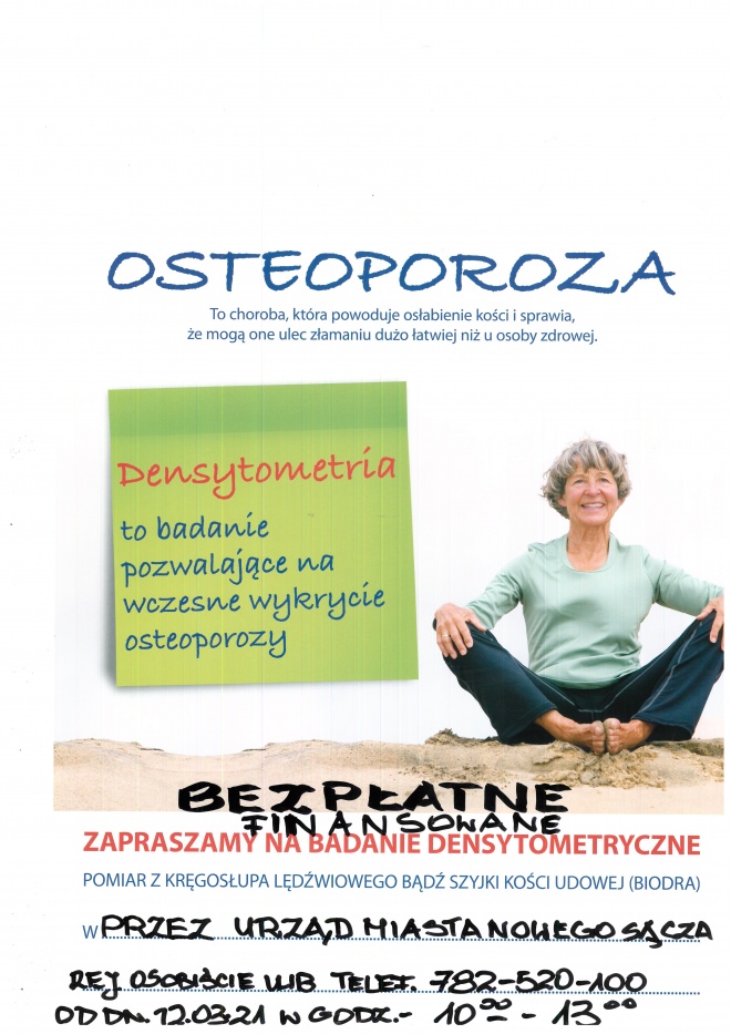 Informujemy, że w Nowym Sączu odbędą się nieodpłatne badania densytometryczne, dotyczące diagnostyki osteoporozy w ramach programu polityki zdrowotnej “Zdążyć przed osteoporozą – profilaktyka”, edycja 2021.