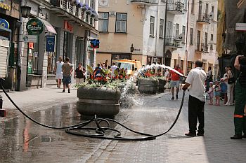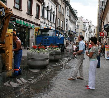 Trwa porządkowanie sądeckiej Starówki. Po upiększeniu płyty Rynku, przyszła pora na ulicę Jagiellońską. Dzisiaj wszystkie służby porządkowe starały się odświeżyć i nadać blask głównej ulicy w centrum miasta. Zatem, pod okiem Dyrektora Wydziału Ochrony Środowiska Zbigniewa Dmochowskiego, Koordynatora Współpracy Międzywydziałowej - Doroty Goławskiej i Ogrodnika Miejskiego - Ewy Klimek, myto nawierzchnię, czyszczono donice, lampy i wymieniano ławki. Na kilka godzin z ulicy Jagiellońskiej zniknęły kosze na śmieci, które poddane zostały renowacji.