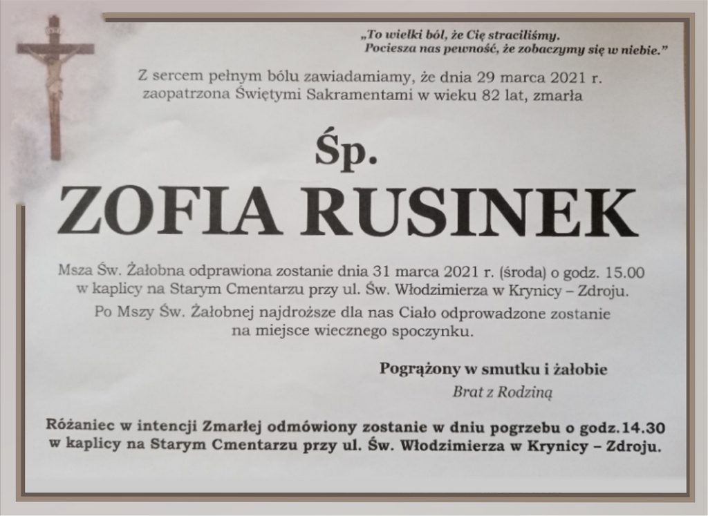 Msza święta żałobna odbędzie się 31 marca 2021 r. o godz. 15.00 w kaplicy na Starym Cmentarzu przy ul. Św. Włodzimierza w Krynicy-Zdroju.
