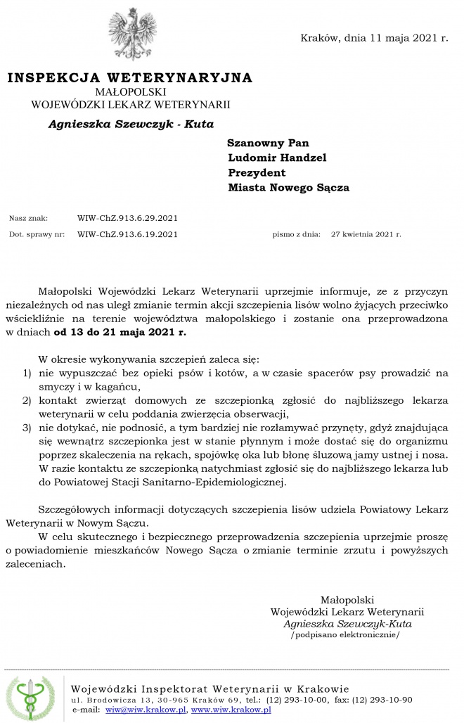 Uległ zmianie termin akcji szczepienia lisów wolno żyjących przeciwko wściekliźnie na terenie województwa małopolskiego i zostanie ona przeprowadzona w dniach od 13 do 21 maja r.
