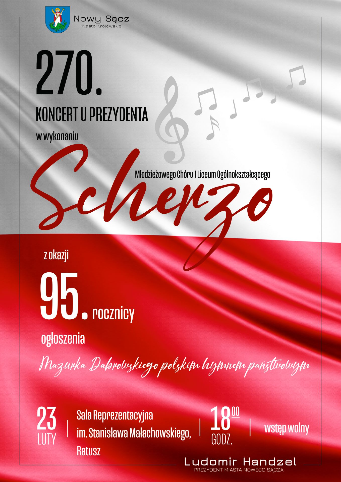 Ludomir Handzel - Prezydent Miasta Nowego Sącza serdecznie zaprasza na 270. Koncert u Prezydenta w wykonaniu Młodzieżowego Chóru "Scherzo" I Liceum Ogólnokształcącego w Nowym Sączu z okazji 95. rocznicy ogłoszenia Mazurka Dąbrowskiego polskim hymnem państwowym.