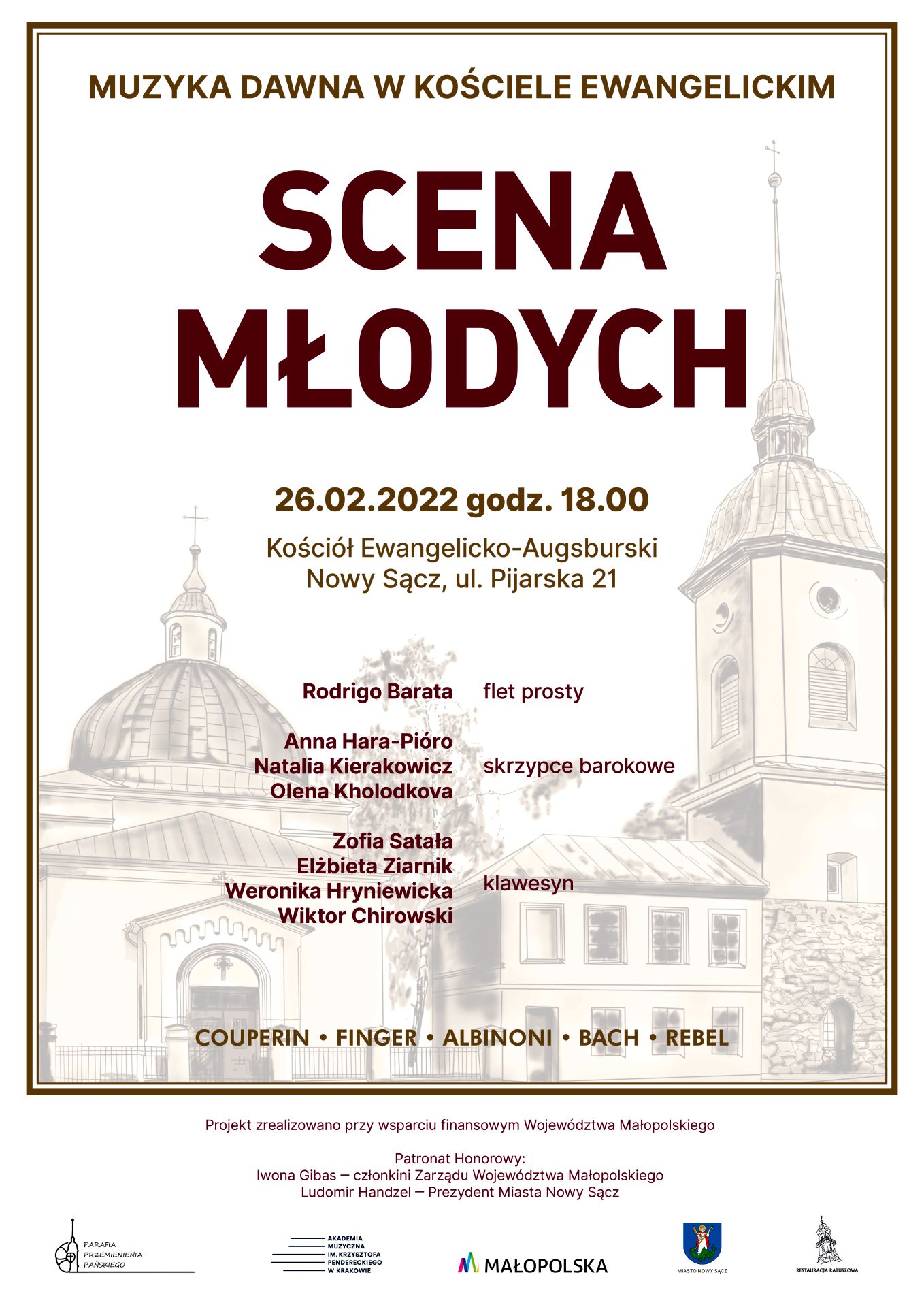 Już 26.02.2022 o godz. 18:00 w Kościele-Augsburskim w Nowym Sączu, ul. Pijarska 21 odbędzie się koncert Muzyka Dawna w Kościele Ewangelickim - Scena Młodych. Zapraszamy!