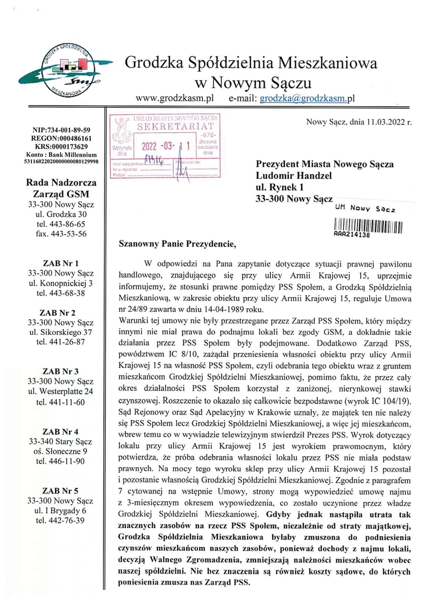 - Wyjaśnienia, które otrzymałem od Zarządu Grodzkiej Spółdzielni Mieszkaniowej są jasne i klarowne. Zarząd SPOŁEM podjął działania zmierzające do przejęcia własności GSM i jest w sporze sądowym ze spółdzielnią mieszkaniową. Zgodnie z przepisami wewnętrznymi spółdzielni taka współpraca nie może być kontynuowana. Dziękuję Zarządowi GSM za wyjaśnienie tematu, obronę interesów członków Grodzkiej Spółdzielni Mieszkaniowej, a także za decyzję, iż w miejscu dotychczasowej placówki SPOŁEM pojawi się także sklep spożywczy. Szczegółowe wyjaśnienia w piśmie Zarządu GSM - mówi prezydent Ludomir Handzel.