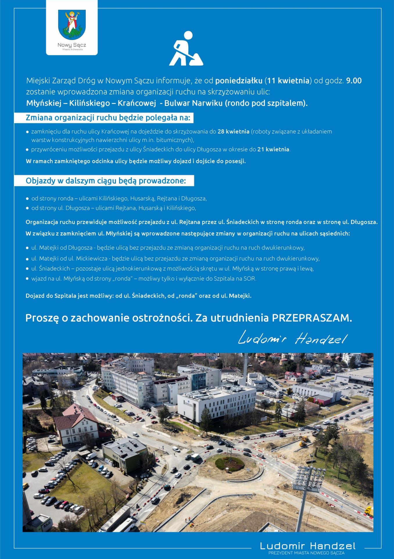 Miejski Zarząd Dróg w Nowym Sączu informuje, że od poniedziałku (11 kwietnia) od godziny 9.00 zostanie wprowadzona zmiana organizacji ruchu na skrzyżowaniu ulic Młyńska – Kilińskiego – Krańcowa - Bulwar Narwiku (rondo pod szpitalem).