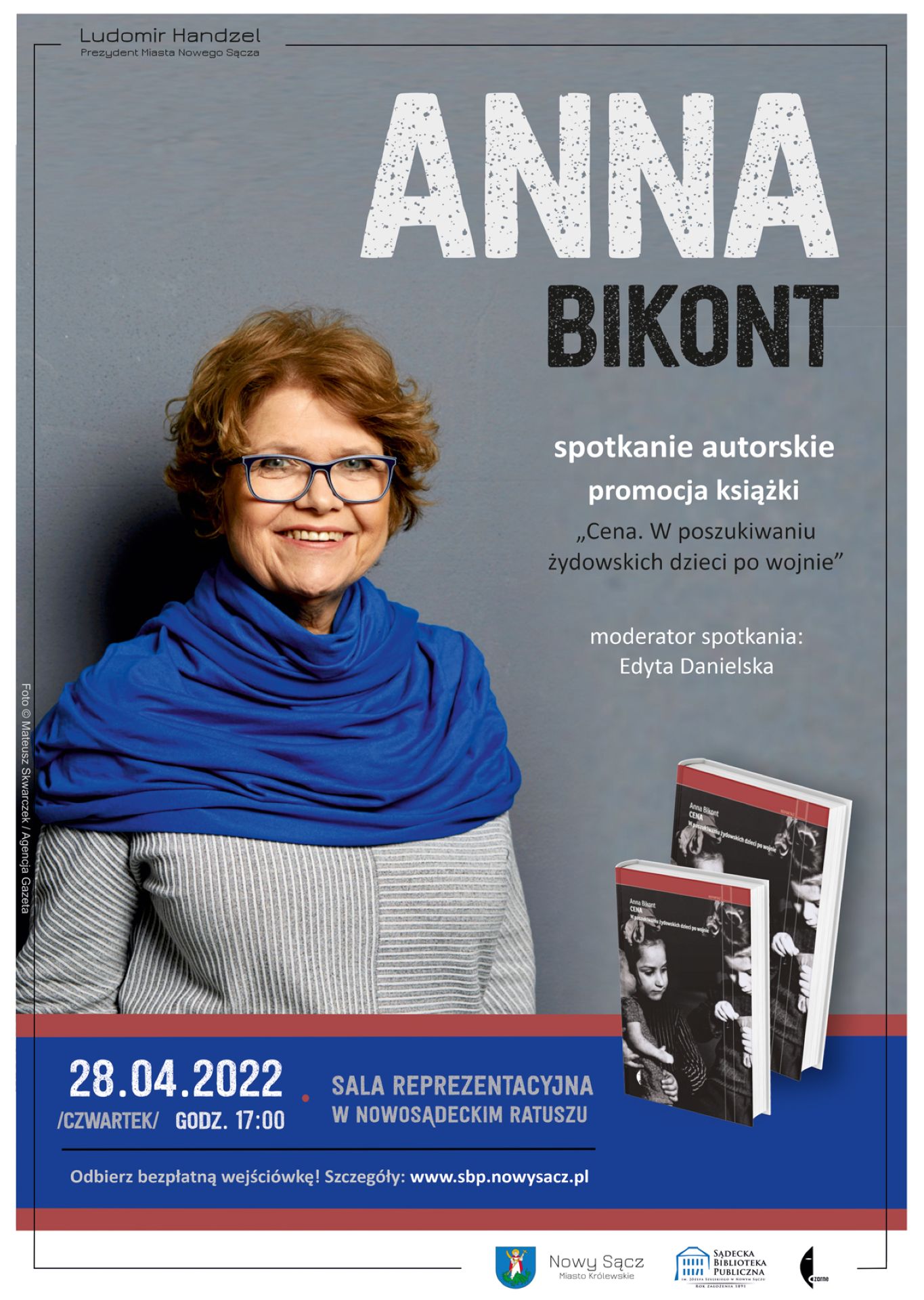 Sądecka Biblioteka Publiczna im. Józefa Szujskiego serdecznie zaprasza na spotkanie autorskie z Anną Bikonti promocję jej najnowszej książki „Cena. W poszukiwaniu żydowskich dzieci po wojnie”.