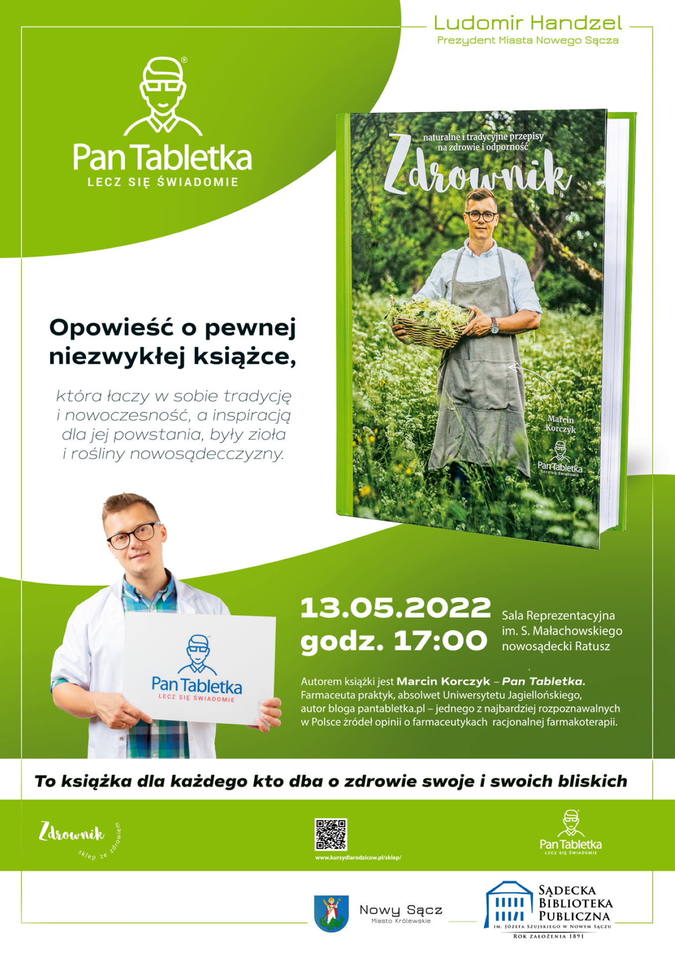 Sądecka Biblioteka Publiczna zaprasza na spotkanie z Marcinem Korczykiem, znanym jako Pan Tabletka, który od 2017 roku dzieli się swoją wiedzą na łamach bloga pantabletka.pl, propagując myśl: „Żyj tak, żeby tabletki nie były potrzebne, a jeśli to niemożliwe, to wybierz najlepsze i stosuj je prawidłowo”.