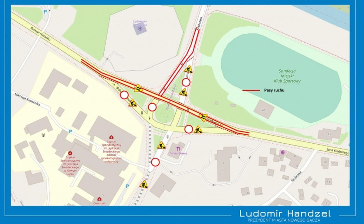Miejski Zarząd Dróg w Nowym Sączu informuje, że w poniedziałek (30 maja) od godziny 7.30 zostanie wprowadzona zmiana organizacji ruchu na skrzyżowaniu ulic: Młyńskiej – Kilińskiego – Krańcowej - Bulwar Narwiku (rondo pod szpitalem). Zmiany są spowodowane układaniem warstwy ścieralnej nawierzchni bitumicznej jezdni na prawym pasie ruchu.