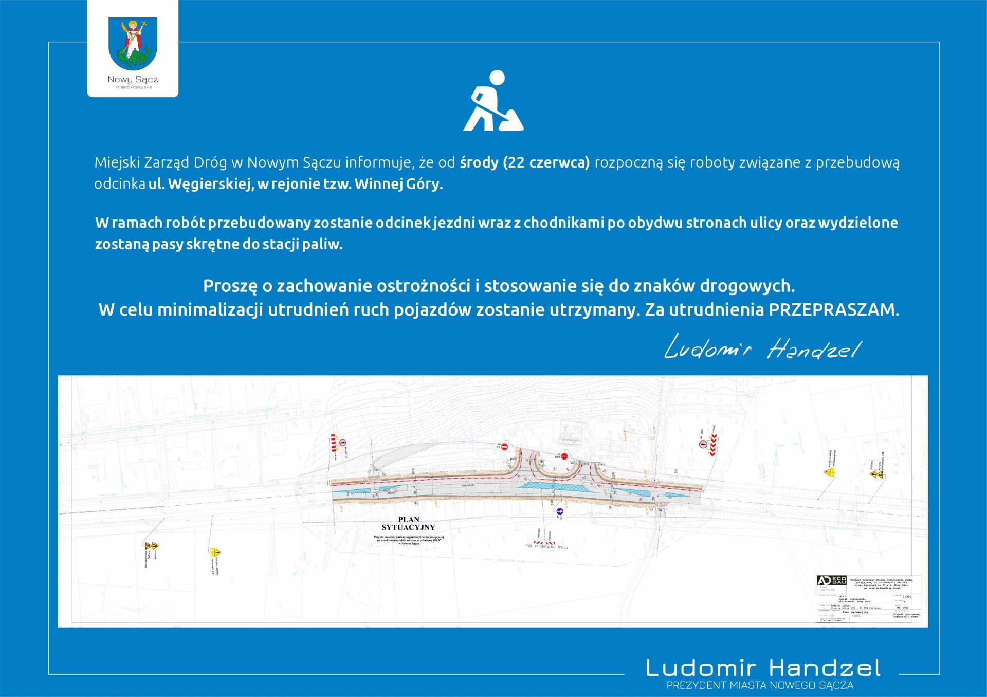 Miejski Zarząd Dróg w Nowym Sączu informuje, że od środy (22 czerwca) rozpoczną się roboty związane z przebudową odcinka ul. Węgierskiej, w rejonie tzw. Winnej Góry.