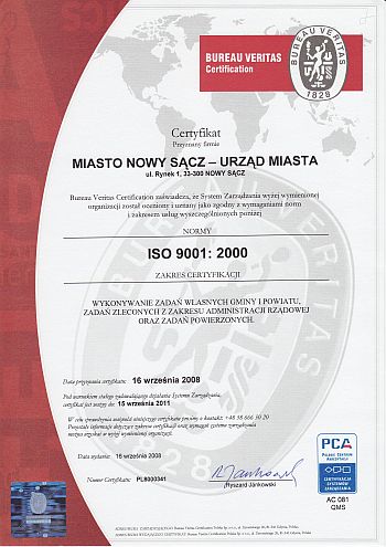 Uroczystość odbyła się w sali ratuszowej 7 listopada 2008 r. i stanowiła zwieńczenie wielomiesięcznych prac nad wdrożeniem systemu zarządzania jakością zgodnego z normą ISO 9001:2000 w Urzędzie Miasta Nowego Sącza.