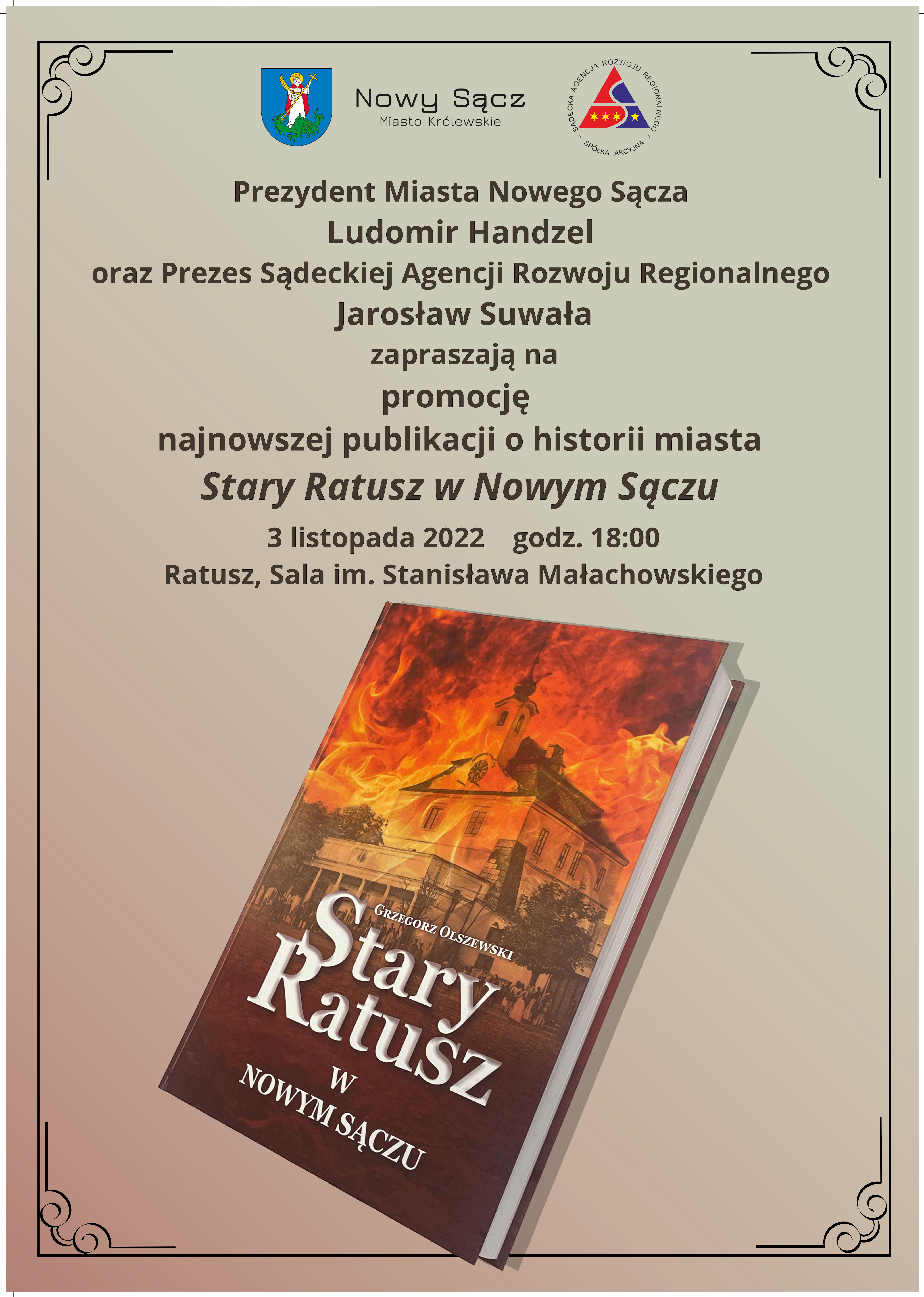 Prezydent Miasta Nowego Sącza Ludomir Handzel oraz Prezes Sądeckiej Agencji Rozwoju Regionalnego Jarosław Suwała zapraszają na promocję najnowszej publikacji o historii miasta "Stary Ratusz w Nowym Sączu".