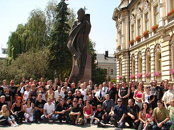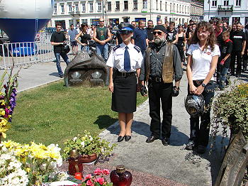 Około godziny 14.00 motory wjechały na płytę Rynku i odbyło się złożenie wiązanki kwiatów pod pomnikiem Jana Pawła II. W imieniu wszystkich miłośników jednośladów, kwiaty pod pomnikiem złożył Andrzej Czech, a w imieniu sądeckich policjantów – asp.szt. Beata Fröhlich, rzecznik prasowy Komendy Miejskiej Policji w Nowym Sączu. W chwilę później wykonano pamiątkowe zdjęcie uczestników zjazdu. Każdy chętny mógł otrzymać pamiątkowy brelok z wizerunkiem patrona kierowców – świętego Krzysztofa i z datą tegorocznej imprezy.