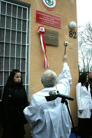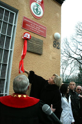 Wiceprezydent Bożena Jawor odsłoniła tablicę pamiątkową, na której umieszczono napis: „Tablica Pamiątkowa nadania sztandaru im. Świętego Józefa Zasadniczej Szkole Zawodowej Cechu Rzemiosł Różnych w Nowym Sączu".