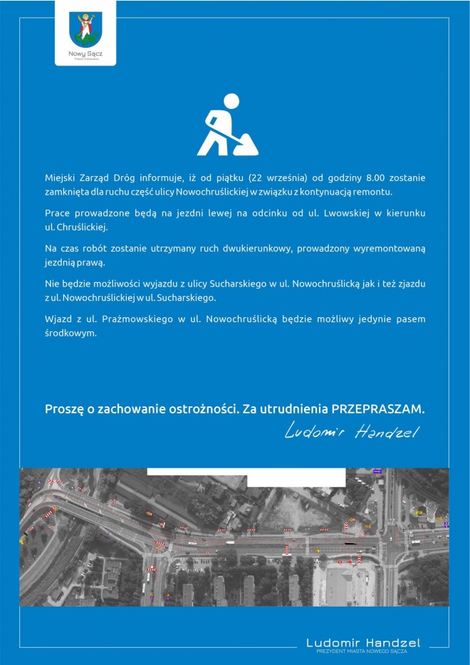 Miejski Zarząd Dróg informuje, że od 22 września (piątek), od godz. 8, zostanie zamknięta dla ruchu część ul. Nowochruślickiej. Kierowcy muszą się liczyć z utrudnieniami.