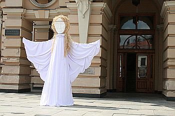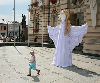 Anioł, w długiej białej sukni z białymi skrzydłami i długich, jasnych włosach oraz pogodnej twarzy stoi na płycie sądeckiego rynku. Anioł zapowiada wielki „Sądecki Jarmark Anielski”, który odbędzie się już w najbliższą sobotę i niedzielę. Trzy metrowa postać wzbudza powszechny zachwyt, mieszkańcy jak i turyści fotografują się razem z anielską postacią.