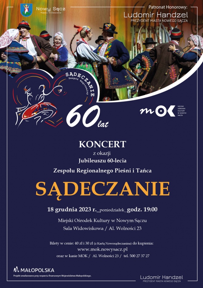 Miejski Ośrodek Kultury w Nowym Sączu zaprasza na koncert Zespołu Regionalnego Pieśni i Tańca "Sądeczanie" z okazji 60-lecia zespołu.