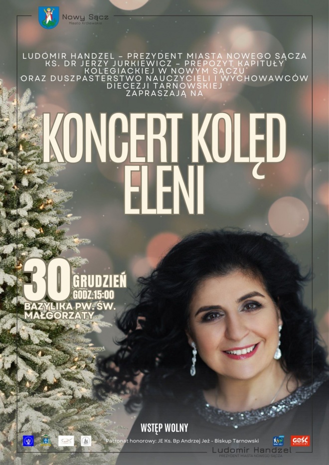 Prezydent Ludomir Handzel,ks. dr Jerzy Jurkiewicz, prepozyt Kapituły Kolegiackiej w Nowym Sączu oraz Duszpasterstwo Nauczycieli i Wychowawców Diecezji Tarnowskiej zapraszają na koncert kolęd w wykonaniu Eleni.