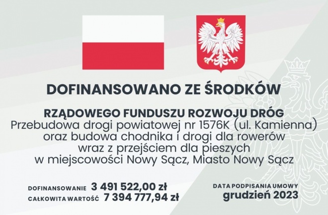 Miasto Nowy Sącz otrzymało dofinansowanie ze środków Rządowego Funduszu Rozwoju Dróg na realizację zadania pn. „Przebudowa drogi powiatowej nr 1576K (ul. Kamienna) w km od 1+217 do km 2+216 oraz budowa chodnika i drogi dla rowerów w km od 1+152 do km 2+216 wraz z przejściem dla pieszych w km od 1+165,25 do km 1+169,25 w miejscowości Nowy Sącz, Miasto Nowy Sącz”