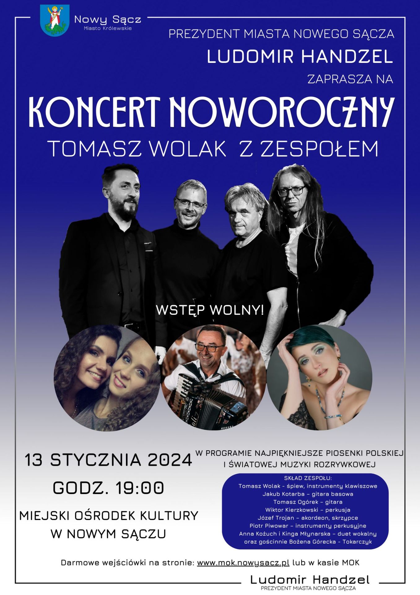 Prezydent Ludomir Handzel zaprasza na koncert noworoczny w wykonaniu Tomasza Wolaka z Zespołem. W programie najpiękniejsze piosenki polskiej i światowej muzyki rozrywkowej!