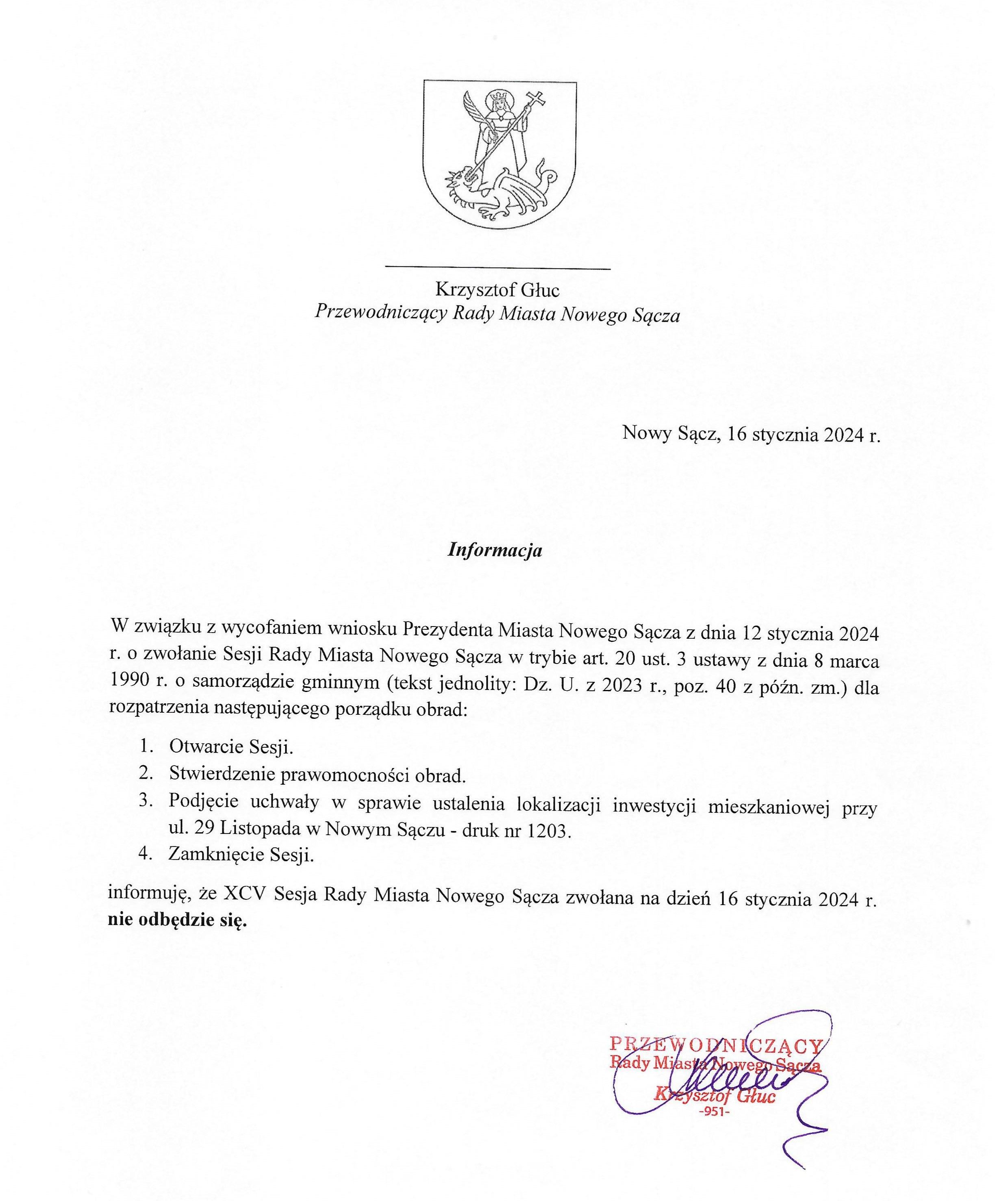 Krzysztof Głuc, przewodniczący Rady Miasta Nowego Sącza informuje, że sesja zaplanowana na 16 stycznia została odwołana.