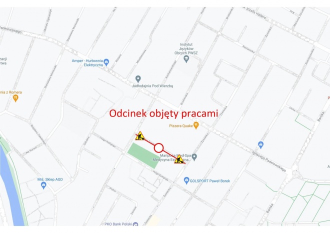 Jednocześnie rozpoczną się roboty związane z wykonaniem nawierzchni asfaltowej na ul. Tłoki, na odcinku wskazanym na mapie.