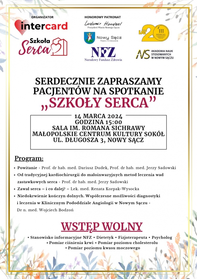 Centrum Kardiologii Intercard w Nowym Sączu zaprasza mieszkańców na "Szkołę serca" czyli spotkanie z ekspertami oraz badania profilaktyczne.
