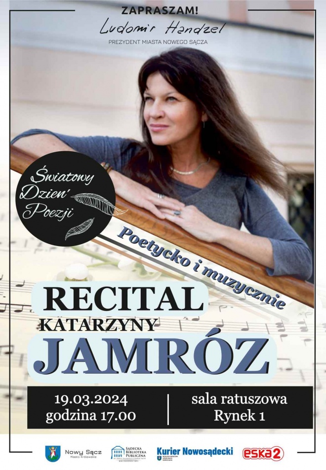 Prezydent Ludomir Handzel oraz Marek Rylewicz, dyrektor Sądeckiej Biblioteki Publicznej Marek Rylewicz zapraszają na koncert „Poetycko i muzycznie” Katarzyny Jamróz – aktorki i piosenkarki, absolwentki Państwowej Szkoły Teatralnej w Krakowie.