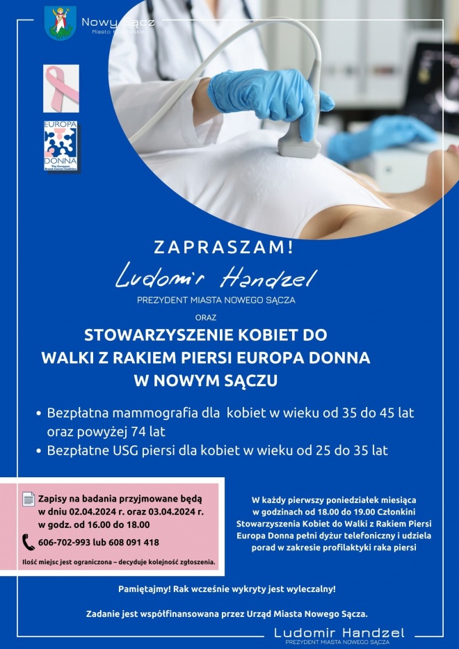 Prezydent Ludomir Handzel oraz Stowarzyszenie do Walki z Rakiem Piersi Europa Donna zaprasza mieszkanki Nowego Sącza do udziału w badaniach.