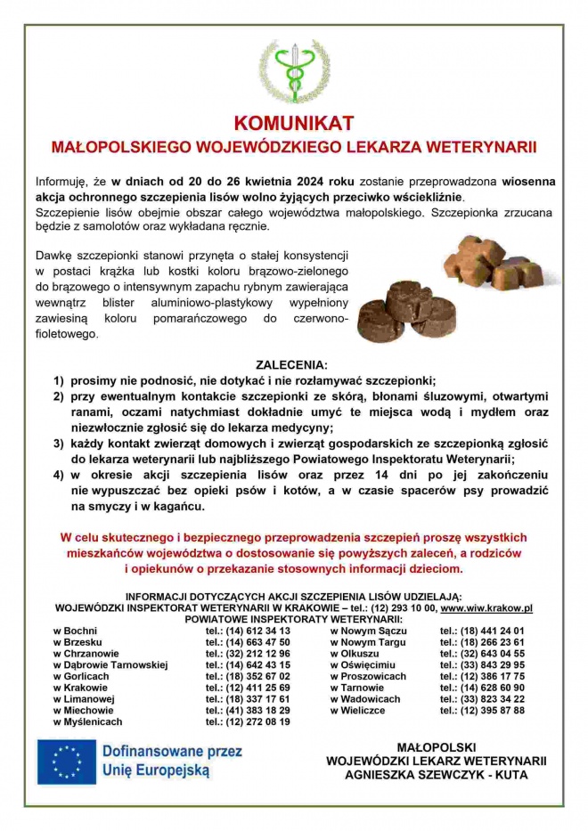 Małopolski Wojewódzki Lekarz Weterynarii informuje, że w dniach od 20 do 26 lipca zostanie przeprowadzona wiosenna akcja ochronnego szczepienia lisów wolno żyjących przeciwko wściekliźnie.