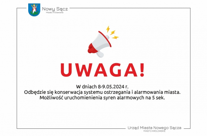 Urząd Miasta informuje, że w dniach 8 - 9 maja mogą zostać uruchomione na pięć sekund syreny alarmowe.