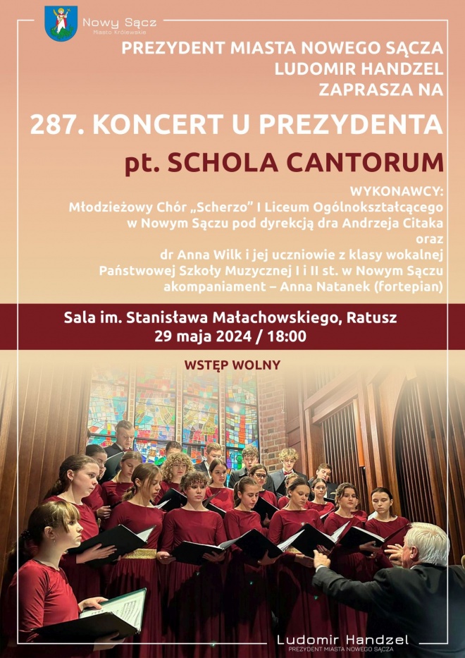 Prezydent Ludomir Handzel zaprasza na koncert wokalny pt. "Schola Cantorum" w wykonaniu Młodzieżowego Chóru "Scherzo".