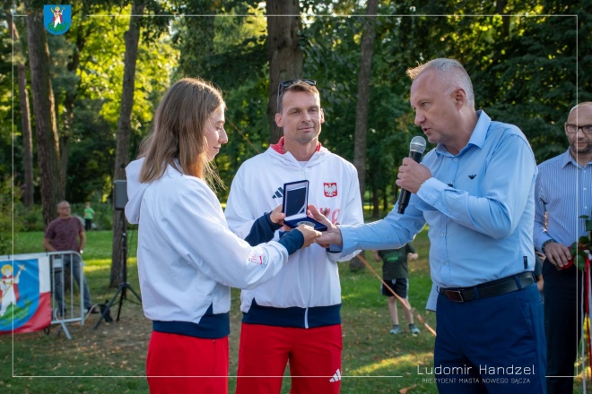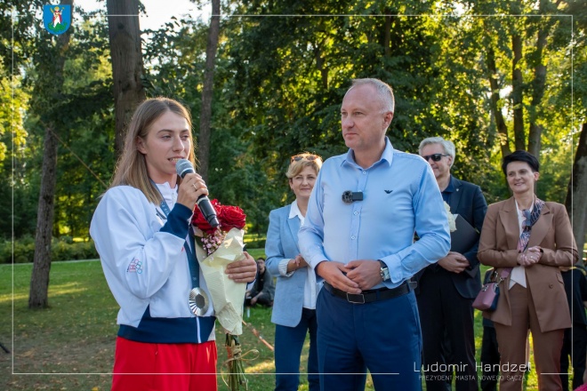 Sądeczanie wraz z prezydentem Ludomirem Handzlem przywitali w Parku Strzeleckim Klaudię Zwolińską, która na Igrzyskach Olimpijskich w Paryżu zdobyła srebrny medal w kategorii K1 slalomu kajakowego.