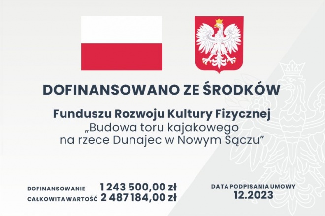 Inwestycja powstała w ramach realizowanego projektu „Budowa toru kajakowego na rzece Dunajec w Nowym Sączu”. Zadanie zostało dofinansowane ze środków Funduszu Rozwoju Kultury Fizycznej w ramach „Programu inwestycji o szczególnym znaczeniu dla sportu – edycja 2023” oraz z dotacji celowej Województwa Małopolskiego w ramach projektu „Małopolska infrastruktura rekreacyjno – sportowa – MIRS”.
